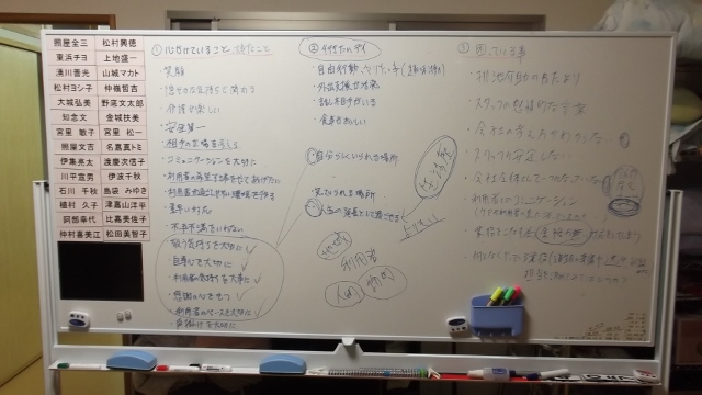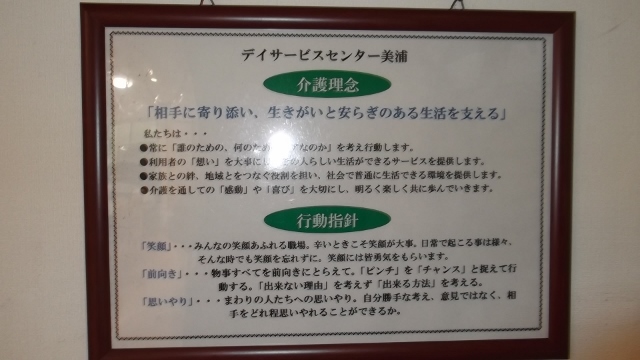 2014/01/14 Category : 未選択 介護理念 昨年末よりスタッフと取り組んでいた理念作成ですが、ようやく完成しました! デイサーイスセンター美浦介護理念「相手に寄り添い、生きがいと安らぎのある生活を支える」=相手と同じ立場に立ち、同じ方向を向く(寄り添い)を基本姿勢とし、その人の「想い」を様々な視点から追求し、その人の真のニーズ(生きがい)を見出す。そして、そのニーズを全スタッフが共有することで、デイサービスが、「その人らしい生活」を感じることができる時間(安らぎのある生活)の一部になれるようサポートする。スタッフのアンケートをもとに、ミーティングを行い、みんなの想いを形にすることができました。みなさんご協力ありがとうございましたー作成だけで満足しないで、ちゃんと現場で活かせるように取り組みましょ!工事も順調です