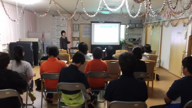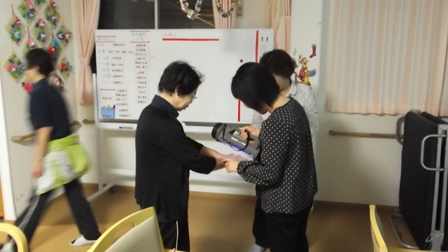 2013/11/21 Category : 未選択 勉強会 介護労働安定センターの無料相談を利用した勉強会を開催しました。3回目の依頼となりましたが、今回のテーマは「チームで取り組む感染症対策」講師はオリブ山病院感染対策管理者の奥原弘美先生です。感染についての基本的知識から個人で取り組む対策、組織で取り組む対策という内容を約2時間の勉強会しました。今年度の労働安定センターを利用した勉強会はこれで終了となりますが、来年もどんどん活用していきたいと思います 手洗いの実践もやっています。蛍光塗料を使用してのチェックみなさんちゃんと洗えていますか~