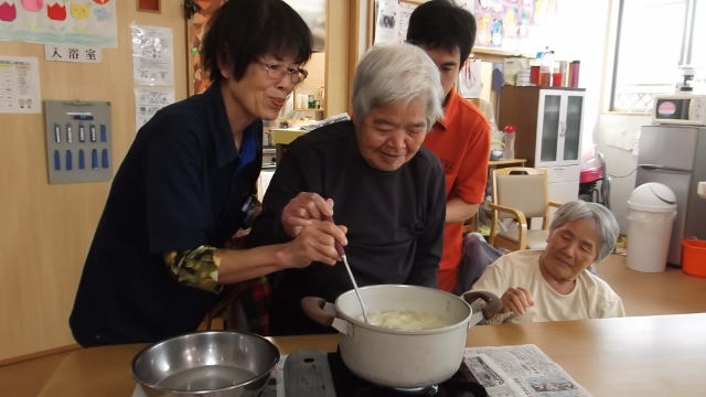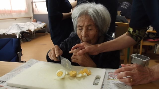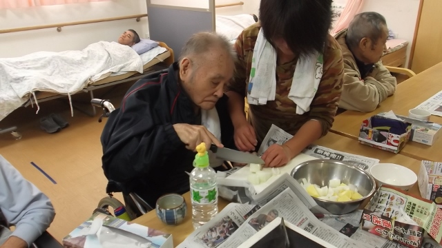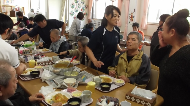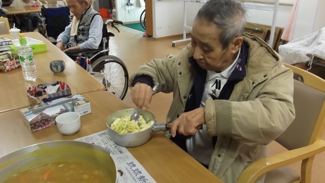 2013/12/12 Category : 未選択 カレーパーティー 11月の行事は、ピクニックの予定でしたが・・・外がかなり冷え込んでいる為、カレーパーティーに変更 材料の下ごしらえから一緒にはじめました久しぶりの包丁は、スタッフが手添えでお手伝いします 付け合せのサラダ担当のKさん。家では、よくテビチを煮込んで食べていたそうです。今日も「カレーにテビチを入れて」と・・・ 自分たちで作ったカレーは大好評みんなで食べたら一層おいしく感じました。次回は、何をつくりましょうか~