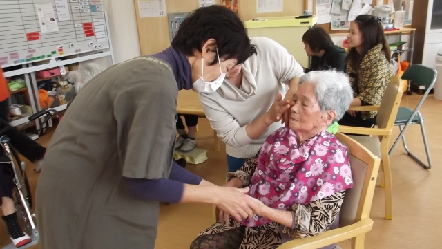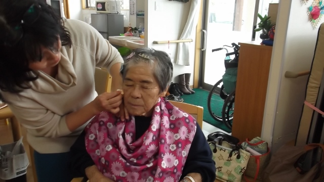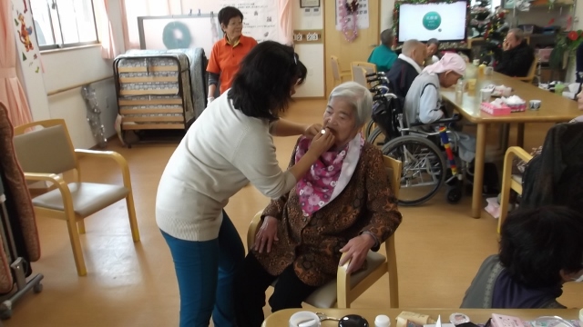 2013/12/25 Category : 未選択 メイクアップボランティア 今日は、メイクアップボランティアのエクラレディー様が訪問されました女性陣は、普段できない化粧やハンドマッサージを受けて大変喜ばれていました。ある利用者さんから「このまま帰るのはもったいないから、どこか連れてって」「お父さんの病院に行って早く見せないと」とメイク療法には・五感を刺激する・コミュニケーションの促進・心身機能の調節 等の効果があるそうですよ~