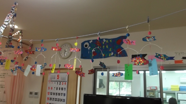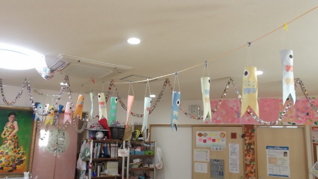 2013/05/20 Category : 未選択 5月の作品 遅れましたが、美浦の鯉のぼりが泳いでいます。風に当たると、鯉のぼりが風鈴のようにクルクル回り、カラフルな鱗がキレイです。奥の大きな鯉のぼりの鱗は、手に絵具をつけてペタペタと模様付けしました。こちらは、去年作成した鯉のぼり(゜))<<